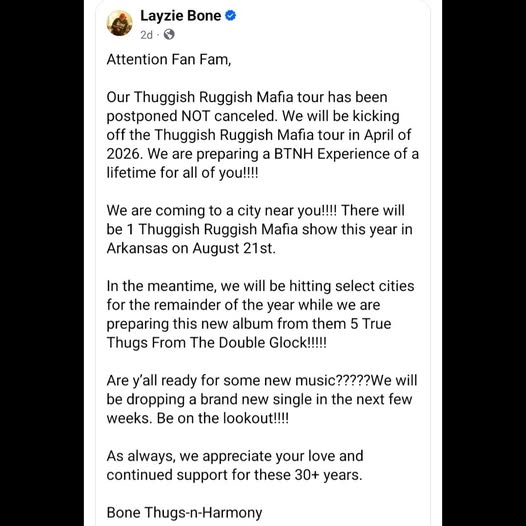 According to recent statements from Layzie Bone and Flesh-N-Bone, the “Thuggish Ruggish Mafia” Tour has been postponed until April 2026. For the remainder of this year, Bone Thugs will be doing concerts in select cities and working on their new album!